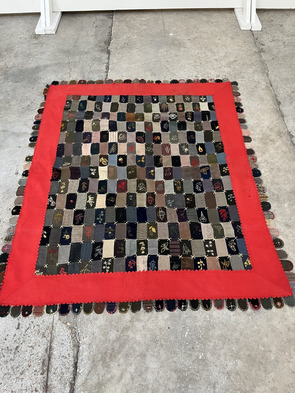 Hand tied using felt, velvet, wool and hand embroidered with a rare scalloped edge